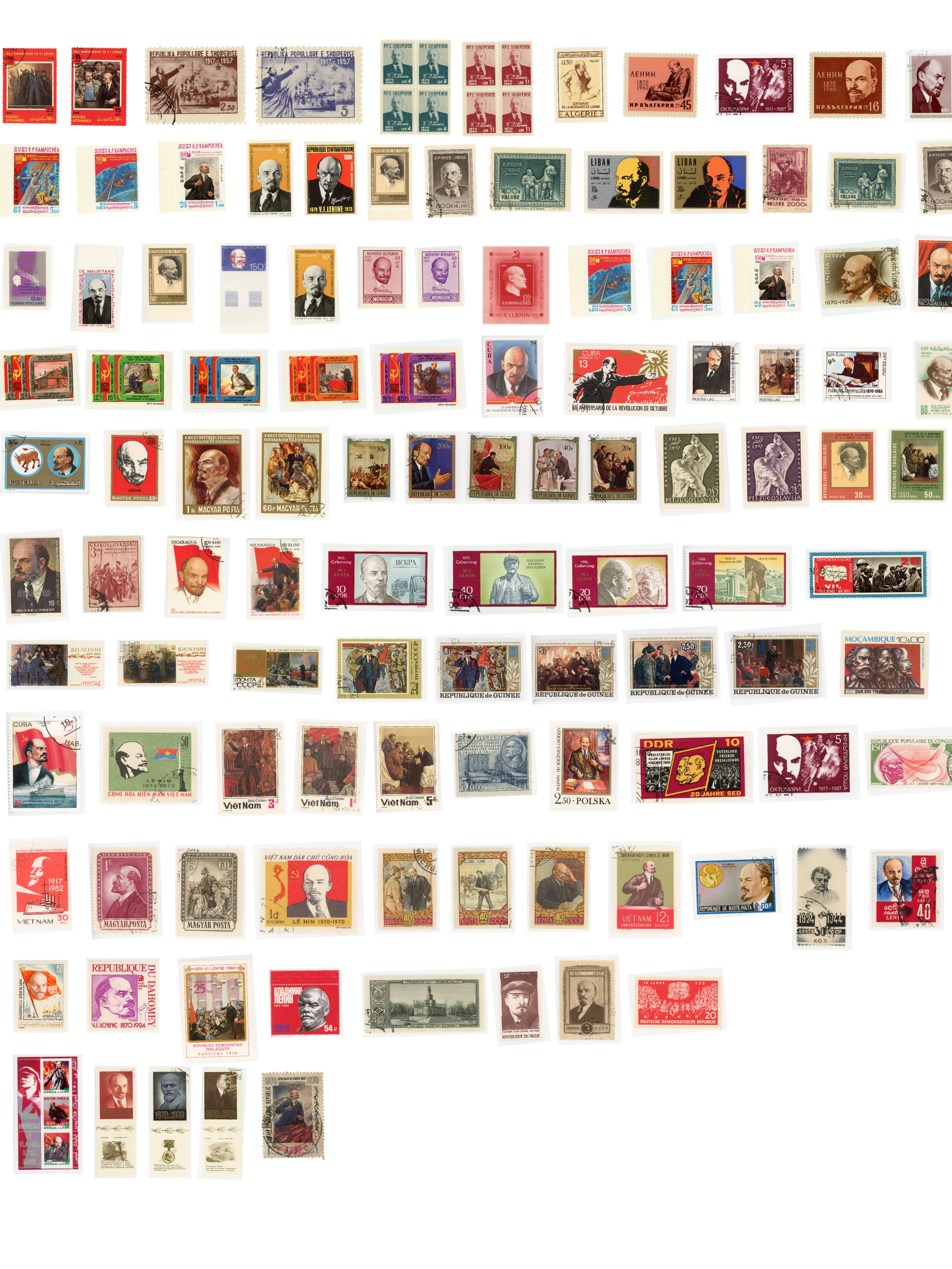 This poster-size image represents a collection of 115+ Lenin stamps, or one from (almost) every country that produced one.